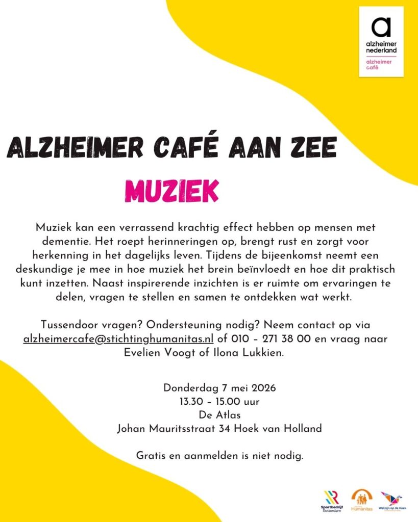 Het Alzheimer Café aan Zee is een maandelijkse ontmoetingsplek op de 1e donderdag van de maand in De Atlas voor mensen met dementie, hun naasten, mantelzorgers en geïnteresseerden. In een ontspannen sfeer worden thema’s besproken die raken aan het leven met dementie — van praktische ondersteuning tot betekenisvolle ervaringen. Voor de bijeenkomsten hoef je je niet aan te melden. Tussendoor vragen? Ondersteuning nodig? Neem contact op via alzheimercafe@stichtinghumanitas.nl of 010 – 271 38 00 en vraag naar Evelien Voogt of Ilona Lukkien.