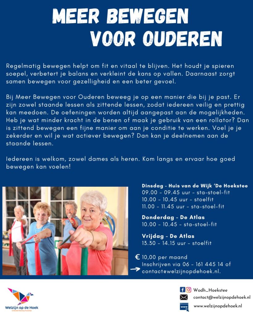 Kom eens kijken in De Atlas (Johan Mauritsstraat 34) op donderdag van 10.00 – 10.45 uur – sta-stoel-fit of op de vrijdag van 13.30 – 14.15 uur – stoelfit. Of kom naar Huis van de Wijk ‘De Hoekstee’ (Mercatorweg 50) op de dinsdag van 09.00 – 09.45 uur – sta-stoel-fit, 10.00 – 10.45 uur – stoelfit of 11.00 – 11.45 uur – sta-stoel-fit. Aanmelden voor een proefles of inschrijven is verplicht en kan via 06 – 161 445 14 of contact@welzijnopdehoek.nl.